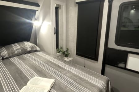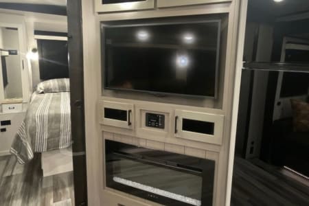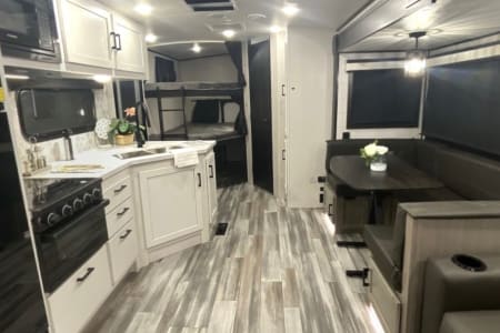 This spacious camper sleeps 8 comfortably with a private bedroom that features a queen size bed, dual wardrobes, and a closet to keep your items organized. The living area has a slide out that expands with theater seat recliners and a U-shaped dinette which converts into a bed. It also has a cozy electric fireplace, a 43” smart tv as well as double bunk beds with charging ports!
