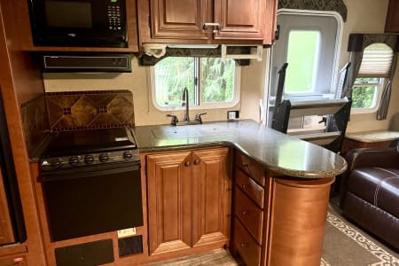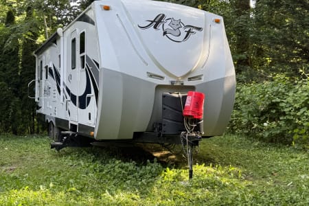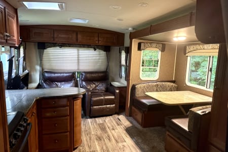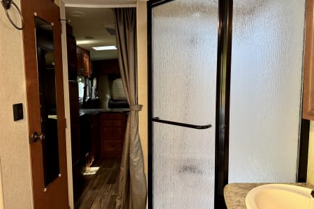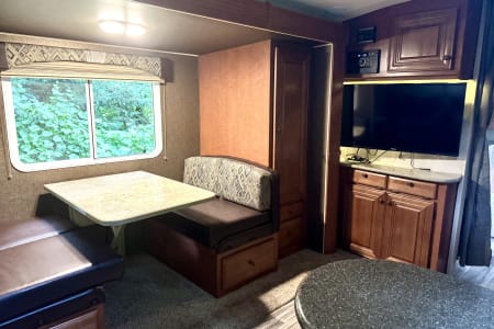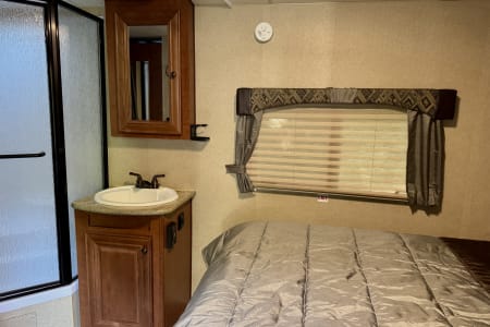 If you like to be out doors and in comfort this is the camper for you. From sitting in the recliners while having your morning caffeine admiring the view from the large windows or swivel the chair and watch some TV or kick back and listen to some music. Staning shower that is separate from the bathroom for that extra room when showering. Swimming or muddy from a trail? Use the out door shower to rinse off. Want to grill out side? Hook into the trailer with your grill and enjoy. Solar panels will make it so you have lights without running your generator or plugging in. Gas/electric water heater propane stove and a gas/electric refrigerator to give you more options if you cannot plug in.