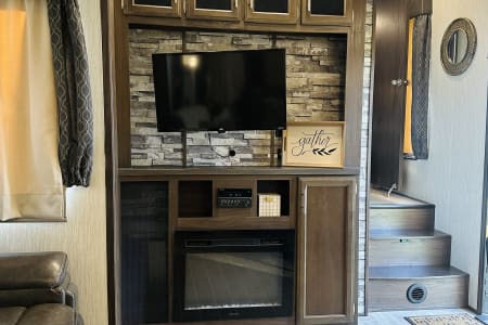 Outside, enjoy a 17” Blackstone grill (connected to propane), an electric awning with LED lights, string lights, and outdoor chairs.