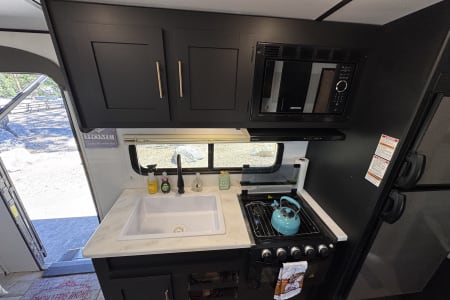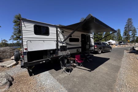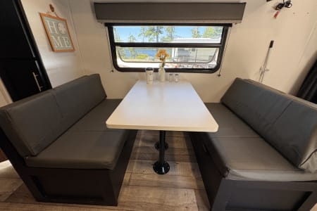 One feature (that was intentional), was our simple layout. We provide all the amenities you need for you basic comfort (sleeping, eating & bathroom), but we didn't want people to get too comfortable and not get what they came for....the great outdoors! So NO Slide OUT (convenient for easy set up) & No living area provided. Just the basics, so you can spend more time connecting with one another Outside and less time indoors.