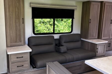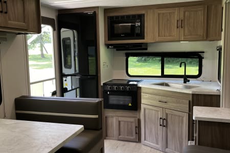 Fully Equipped Rear Kitchen – Whip up meals with the two-burner stove/oven, microwave, and a 10 cu. ft. 12V refrigerator.