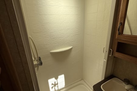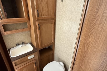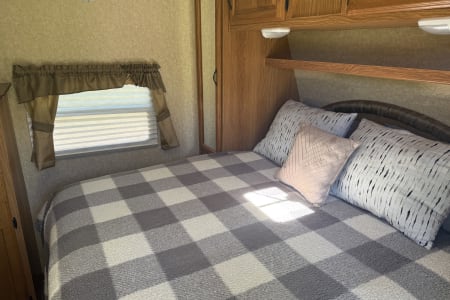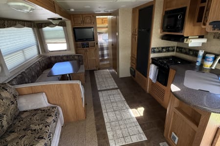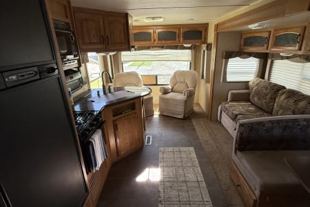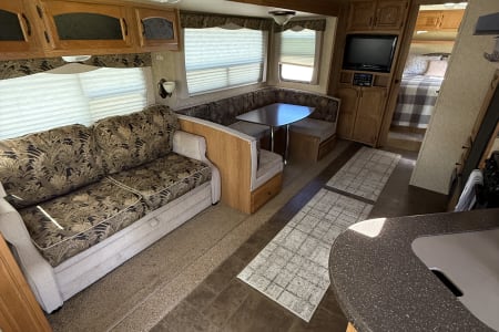 This trailer provides all of the comforts of home. This trailer has a Premium mattress and its own entry door to the bedroom. It has a 3/4 bathroom along with a dining room table that converts to a full size bed. It has a fridge, freezer, oven, stove and a kitchen sink for your convenience. It comes with a sofa and two comfortable sitting chairs. It is equipped with an AC Unit and heater to make your trip cozy (no matter what the weather).