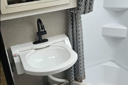 - Custom foldable bathroom sink (cold water only) — installed since Jayco didn’t include one in the original design