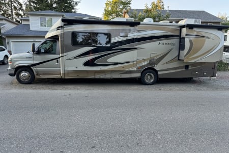 Triple Slide Melbourne Class C Motorhome by Jayco, Rear Queen Bed Slide out w/Overhead Cabinet, Wardrobes, TV, Shower, Private Toilet Area w/Lav. & Med. Cabinet, Refrigerator, Kitchen Sink, 3 Burner Range/Microwave/Comfort Lounger Slide out, Sofa Table, Storage w/TV Above Cab Area, Booth Dinette Slide out, 16' electrical Awning and Much More.