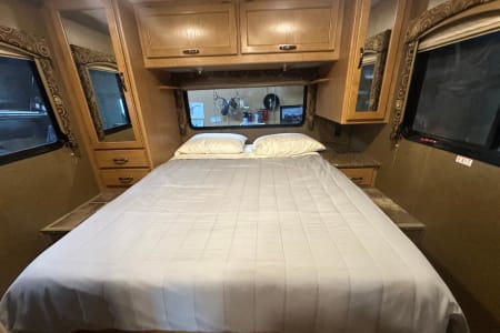 Sleeps up to,7 / Recommended 4 Adults and 3 Children This is a 29-foot Class C RV, perfect for a week or longer getaway or a comfortable sightseeing trip for a family of 5. Easily maneuverable, this conveniently set up RV sleeps 4 with a rear queen bed and an over-the-cab bed. Plus, the dining table converts to another bunk at night if needed. This RV has all the conveniences you’ll need for an extended trip, with an exterior storage bay, awning, a sink, shower, hot water heater, stove, microwave, fridge and freezer plus an auxiliary battery and generator on-board! This RV is equipped with a flat-screen TV with DVD player, and an AM/FM radio with CD player for your entertainment.