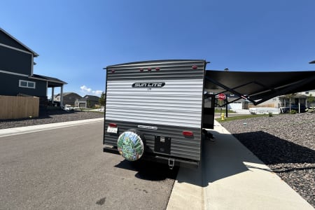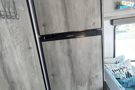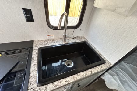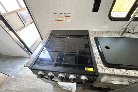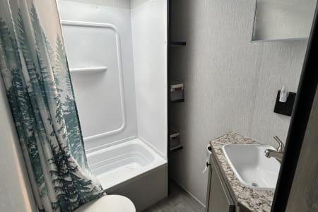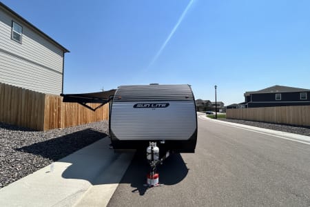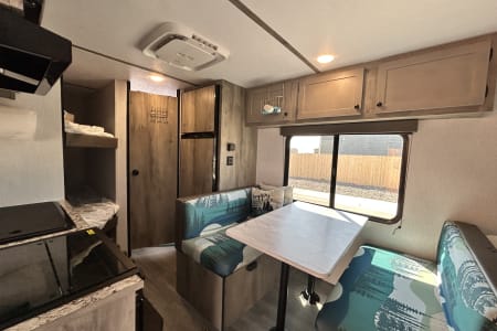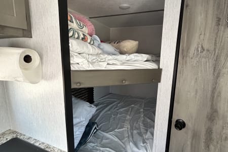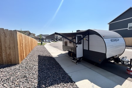 This 2026, 21 foot duel axle camper is amazing! Freezing cold AC, heater, tub with shower, toilet, full size fridge and freezer, dining table, LED awning, double wide bunks, and super light weight. This camper is easy to pick up and just go. Use for in and off grid camping. I do not have a trailer brake adapter so you must provide one.