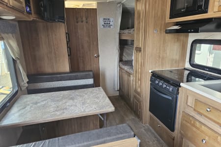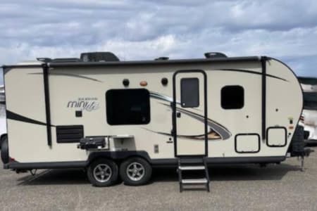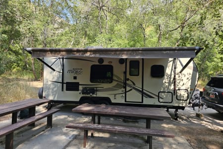 Enjoy camping in this 24' travel trailer. This trailer is easy to maneuver and SO MUCH FUN! Lot's of storage, and if you like the outdoors you can use the outside shower in addition to the interior one! During the day just fold up the queen sized murphy bed and there is now a sofa for additional seating. Along with these features there are also speakers on the outside, to enjoy while you are BBQ'ing, we have sway bars for easier towing and an automatic hitch (just press a button). When you rent from us you will also get to meet Lola, she loves new people to meet!