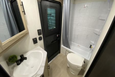 **Delivery and set up at site** This luxurious travel trailer makes for the perfect getaway and can accommodate a large group that can sleep 6-8 ! The master bedroom includes a queen sized mattress (sleeps 2) , 2 large closets with plenty of storage space and a TV with Roku. The kitchen is fully equipped with everything you need to prepare a home-cooked meal, including a three-burner gas range/convection oven, microwave, coffee maker, toaster, cooking utensils, and a large pantry. The main living area has tons of room for entertaining or just relaxing the day away. There is pull out sleeper sofas that converts into a bed that sleeps 2 and a full dinette set that sits 4-6 that also converts into a bed that sleeps 2 and Two Full size bunk beds that sleep 4* (up to 250 lbs) for a total of 8* person seating area or an 8 person sleeping area. Watch your favorite movies on the oversized Smart Roku flat screen TV that includes Netflix, Disney included, or kick back while enjoying the electric fire place. The exterior includes an oversized electric awning with LED lighting, 2 led lite exterior speakers and Outdoor Kitchen.