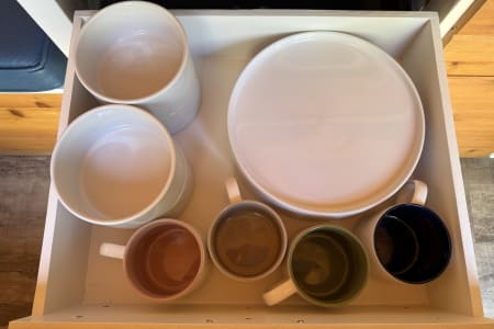 Fully stocked kitchen: pan, pot/lid, plates (4), bowls (4), mugs (4), cutting board, utensils (4 sets), cutting knives, scissors, spatula, can opener, tongs, wine key, lighter, coffee maker, portable Coleman stove w/ 1lb propane canister