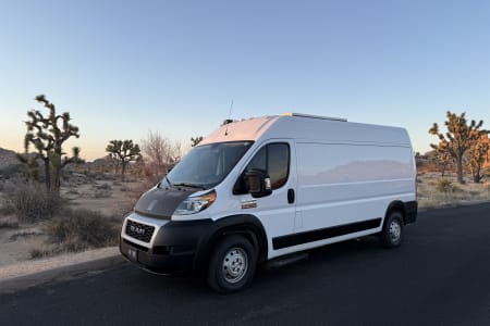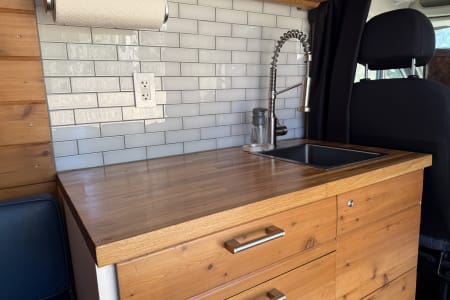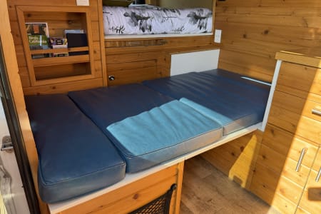 A golden glow of natural pine greets you as you enter this bohemian inspired glamping van. Includes all the basics: full-size bed plus a converted dinette bed (sleeps 3 total), running water, sink, slide-out table, solar power, outdoor shower, heater, roof fan, refrigerator/freezer, and portable Coleman camping stove. Sip coffee in the morning as you gaze out in the Yosemite backcountry, California beaches, majestic Redwoods, Tahoe’s shimmering lake, or the desert beauty of Joshua Tree. Enjoy being off grid or working remotely from anywhere with satellite wifi (available as an add-on). Seats 3 with seatbelts. Wood finished throughout for a cozy, comforting vibe on your home away from home.