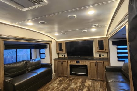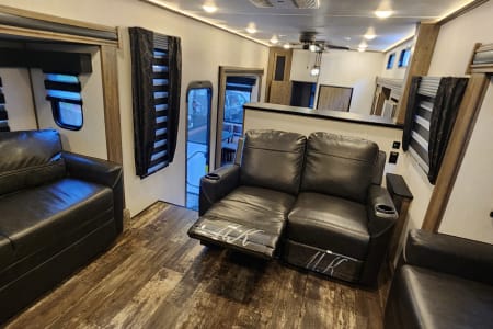 Wonderful and spacious camper, perfect for camping, fishing, hunting camp, or staying on-site at an event. It sleeps 4-6 adults comfortably but fits even more for entertaining. It has 2 pull out couch beds(full size) along with 2 heated recliners, a spacious kitchen and dining room, along with 1.5 baths. There is a residential sized refrigerator along with an outdoor kitchenette.