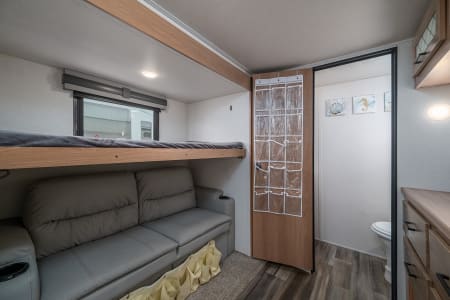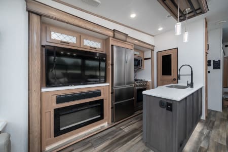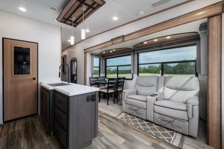 The Sanibel RV epitomizes refined luxury, boasting a king-size master bedroom, a queen loft bed, two bedrooms, and two bathrooms. Indulge in heated massage recliners, elegant white marble countertops, a residential-size refrigerator, and a spacious shower—all designed to comfortably accommodate 8 to 10 guests.