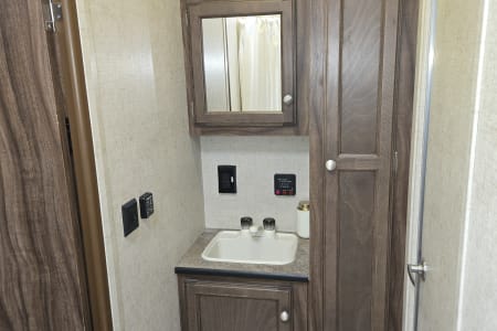 35' toy hauler is the ideal blend of rugged functionality and cozy comfort. With plenty of room to stretch out and relax, it features a master bedroom with a queen-sized bed, a full bathroom, and a living area with a dinnet, which can convert into a bed and a third Full XL bed in the garage . The kitchen is fully equipped with a stove, microwave, and refrigerator and cooking accessories making meal prep a breeze. It's the perfect setup for a family vacation or a trip with friends.