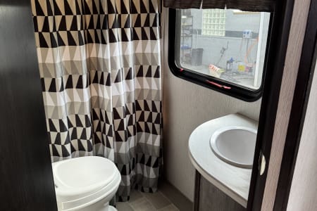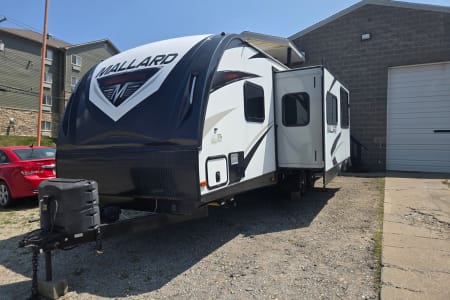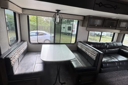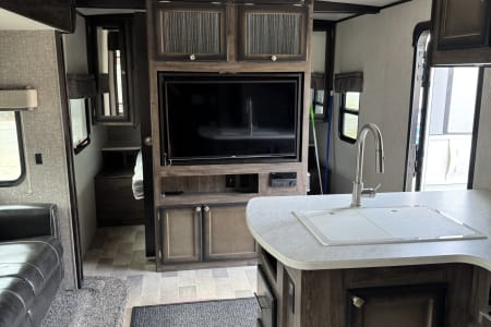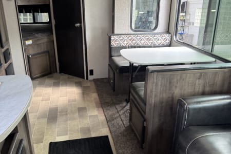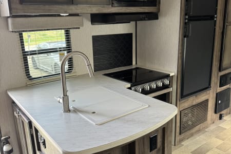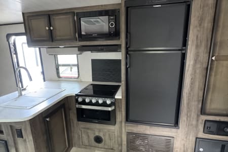 This camper sleeps 6 and includes coffee pot,toaster,pots and pans and all other kitchen necessities. It has a shower and tub in it. It has 1 slide out and is perfect for your next family vacation. The camper is 1/2 ton towable and we provide all things necessary for smooth towing.