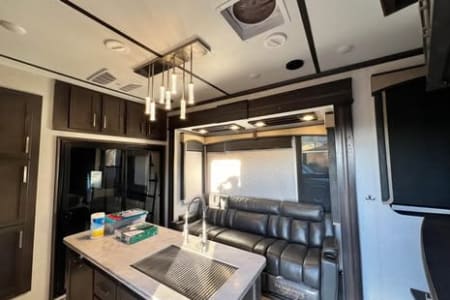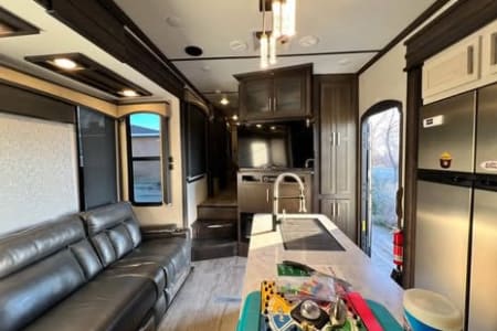 Great family toy hauler available for your getaway. Comfortably sleeps seven with at home feel. Full bathroom, shower, rear bunks and a 13 foot garage. Two gas fuel tanks with a pump station.