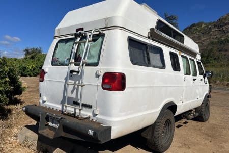 This camper is perfect for those who are looking for a very unique van with essentially everything you need in a trip, whether it’s long or short. Cruise the island in this local vibes ride! See all the details below for a list of items/amenities that The Big Kahuna offers! Features a high ceiling so you can walk freely in the expandable living space (a person 6 feet tall can stand upright inside), a queen bed, 200w solar power with 100Ah lithium battery and 40A alternator charging so you never have to worry about being without power even on cloudy days, sink with 30 gallon fresh water tank, fridge with freezer, maximum ventilation (key to enjoying island climate) with 12 openable windows 2 roof fans and 2 movable plug in fans, portable propane stove, all basic cookware and dishes, outdoor shower, beach towels and more. All windows have sliding or removable curtains for additional privacy and security. Tons of additional gear for rent including 2 person inflatable kayak, inflatable SUP (optionally can be equipped as a wind SUP with sail etc.), snorkeling gear including fins masks diving buoy etc., body boards, surf boards, camping chairs, coolers and more. Please note The Big Kahuna is a BIG guy (20 feet in length, 9 feet in height). Drive with caution, and beware of the clearance! Contactless pickup/drop-off available in Wahiawa (~25mins from the airport) from 6AM to 8PM. Drop off available at the airport for additional fees. We love our Big Kahuna and take care of it wholeheartedly. We hope you can treat this nice old guy like you do with your own property :) mahalo!