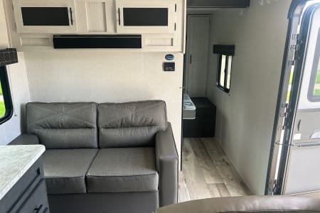 Hello! Any 1/2 ton truck or large SUV can tow this with ease! This camper can sleep roughly 5-8 people. 5 adults comfortably or 8 with a mix of adults and kids. Propane furnace for heat, rooftop AC, dual propane/electric hot water heater. Looking for a step up from the smaller 17-23ft campers that work but lack the space and storage? Don't want to deal with slide outs or a bigger heavy duty truck? This is the camper for you!