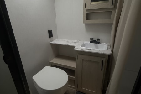 Queen Bed Room on the front end with Closest space and storage beneath and above the bed.