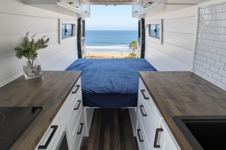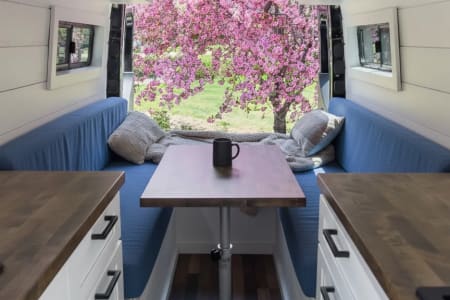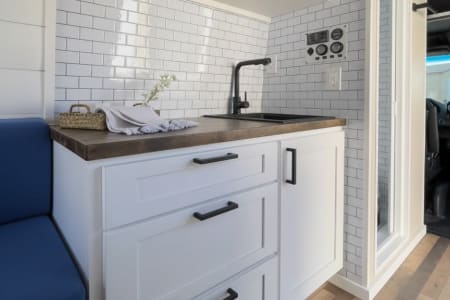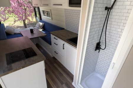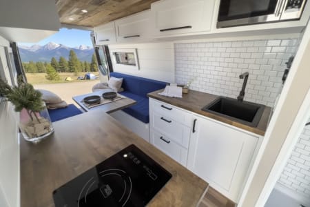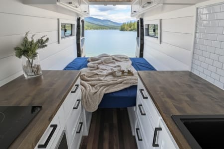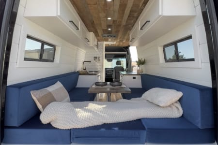 You wanna travel - but do it in style? Our 2021 Mercedes Sprinter van is built just for you! We are ready for you to experience all that Sprinter Van Life is about. Below are some of the details about the custom build out of our van. (hint: original purchase price was $225k) Zion 170 Spec Sheet | Mercedes Sprinter 170 ext Standard build options Electrical • 400W Renogy solar with controller and bluetooth monitoring • 300AH Victron lithium battery / Victron 3000W inverter charger • 30A shore power plug / Orion XS 50 DC to DC charger • 12V AC unit / Brand New! • USB / 12V / 120V outlets • Recessed lighting 5 pucks with dimmer switch Interior Dinette with butcher block table top / memory foam seat cushions (blue) Dinette converts to a king size bed Side window sliding door / Bedside window Left / Bedside window Right Shiplap on ceiling and walls Kitchen countertop of your choice w/ Deep sink Large full extension kitchen cabinet drawers / RV grabber latches on all drawers Custom overhead cabinets / Pneumatic cabinet struts Headliner storage shelf above driver/passenger cabin Sound deadening / Havelock Wool insulation Water Fully enclosed shower / portable casette toilet 36x24" shower pan w/ custom shower accessories Dometic CRX 110E Refrigerator and Freezer / Household 0.7cu microwave 42 gallon fresh water tank 20 gallon grey water tank for shower Electric Fresh water level gauge / Grey water level gauge 2.8GPM Seaflo water pump / Seaflo accumulator tank / Stealth Fresh water fill Bosch 4 gallon electric hot water heater