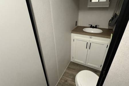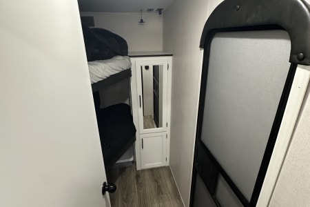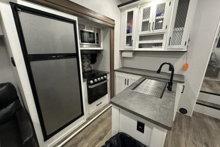 This model is only 36 ft long with a primary room over the hitch and a bunkroom in the back making this a perfect unit for the family. It has two double bunks at rear of the living area with a half bath ,three slides ,two in the kitchen area with a Wardrobe slide in the primary bedroom. 8 cu ft fridge standard, Furrion Chef collection kitchen appliances, One control touch screen. 50 amp electrical service, Flip up solid entry step, sound bar, motion sensor lighting. Outside kitchen with a mini fridge and 2 burner stove. There is plenty of storage inside and out of the camper. All bedding and towels are furnished. All mattresses and pillows are protected with waterproof zippered covers.