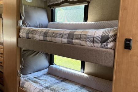 33 ft RV with a bunkhouse. This is a very family friendly RV with sleeping for 8. Queen Bed, Bunk over cab (54" by 87"), Jack Knife Sofa, Dream Dinette, and Bunk Beds (27" x 72").