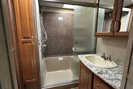 The kitchen island will be perfect for preparing your meals and cleaning up after and the office space is right across from the entry door. You can now have a designated area for working if you go for an extended stay and can work from "home."