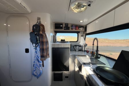Interior Kitchen Setup - The front galley with its 2-burner propane stove makes cooking inside easy, with everything you need to whip up memorable meals and dine outside under the stars.