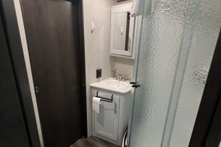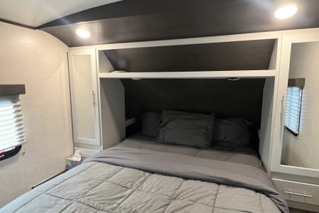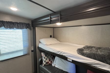 The private master bedroom features a queen bed with fresh linens and plenty of storage. In the back, the bunkhouse gives kids or extra guests their own space, complete with bunks and an additional sofa. The bathroom has a spacious shower, toilet, and sink — stocked with towels, soap, and basic toiletries.