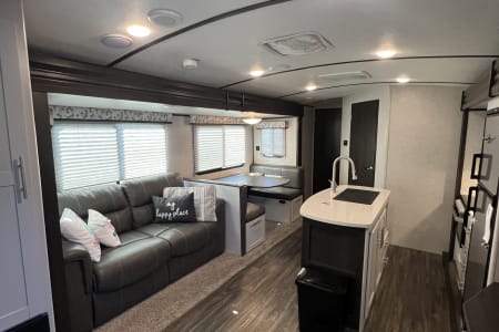 Inside, you’ll find a bright, open living area with dual slide-outs, a large sofa, dinette, and a flat-screen TV with Bluetooth sound system. The kitchen is fully equipped with cookware, utensils, plates, cups, pots and pans, knives, and all the essentials to make meals easy while you’re away. There’s also a large refrigerator, three-burner stove, oven, and microwave.