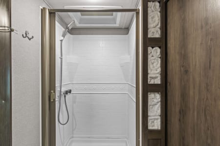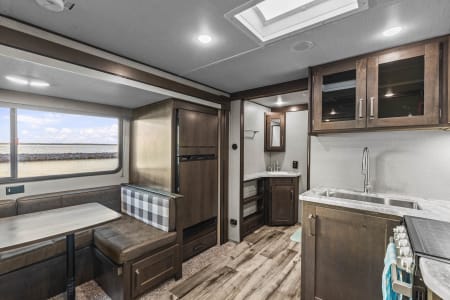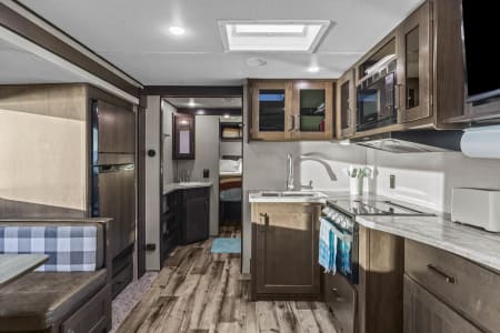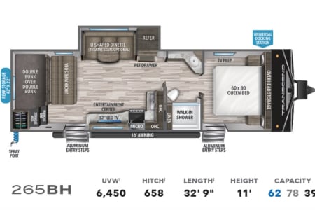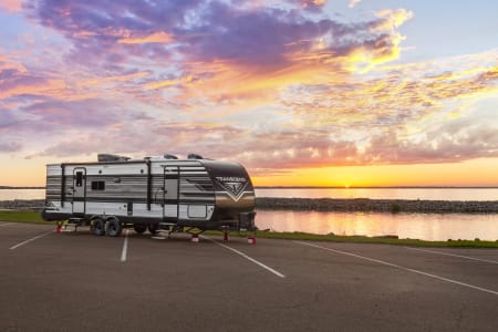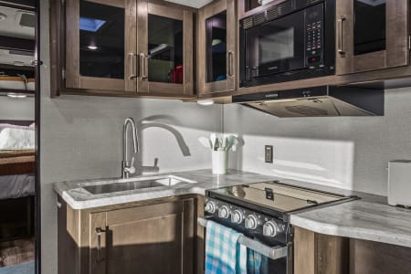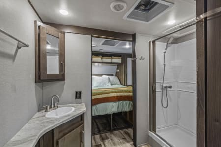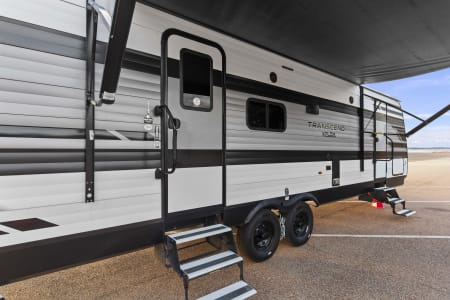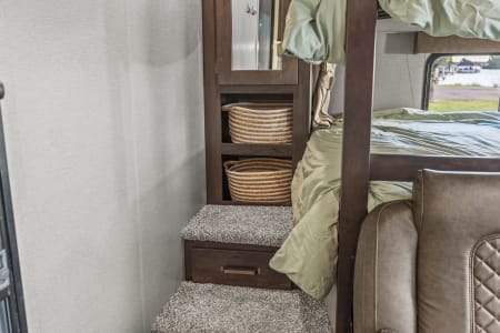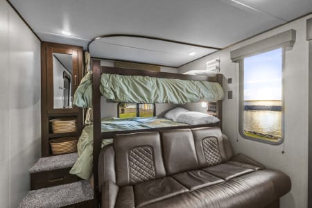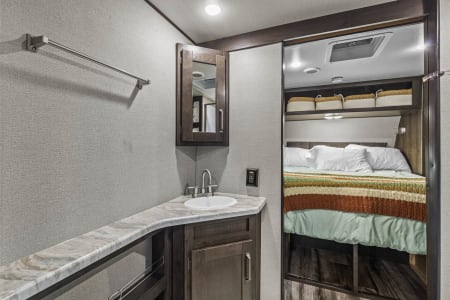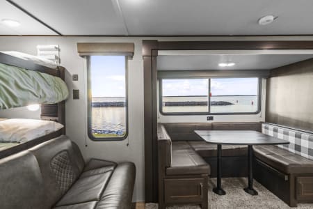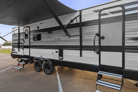 Looking for a different kind of getaway or just need extra place for guests to sleep? We'd love for you to share our beautiful bunkhouse camper! The private bedroom in this 2023 Grand Design Xplor 265BH has a queen size bed with upgraded after-market mattress, its own private entrance, and great storage. The bunks are both full size and have teddy bear mattresses that have been upgraded with foam toppers. The sofa and dinette both convert into extra sleeping areas. Our camper is outfitted with pretty much everything you could need. All bedding and towels are provided. The kitchen has plates, cups, pots, pans, coffee maker, toaster, etc. A grill and air fryer are provided. The camper also comes with a folding table for outside use. The smart TV has HDMI connections to hook up your gaming system/Bluray player. It also can connect to WiFi. We can provide Starlink internet service for an additional fee. We will deliver and set-up the camper for you. The camper is not available for customers to tow.